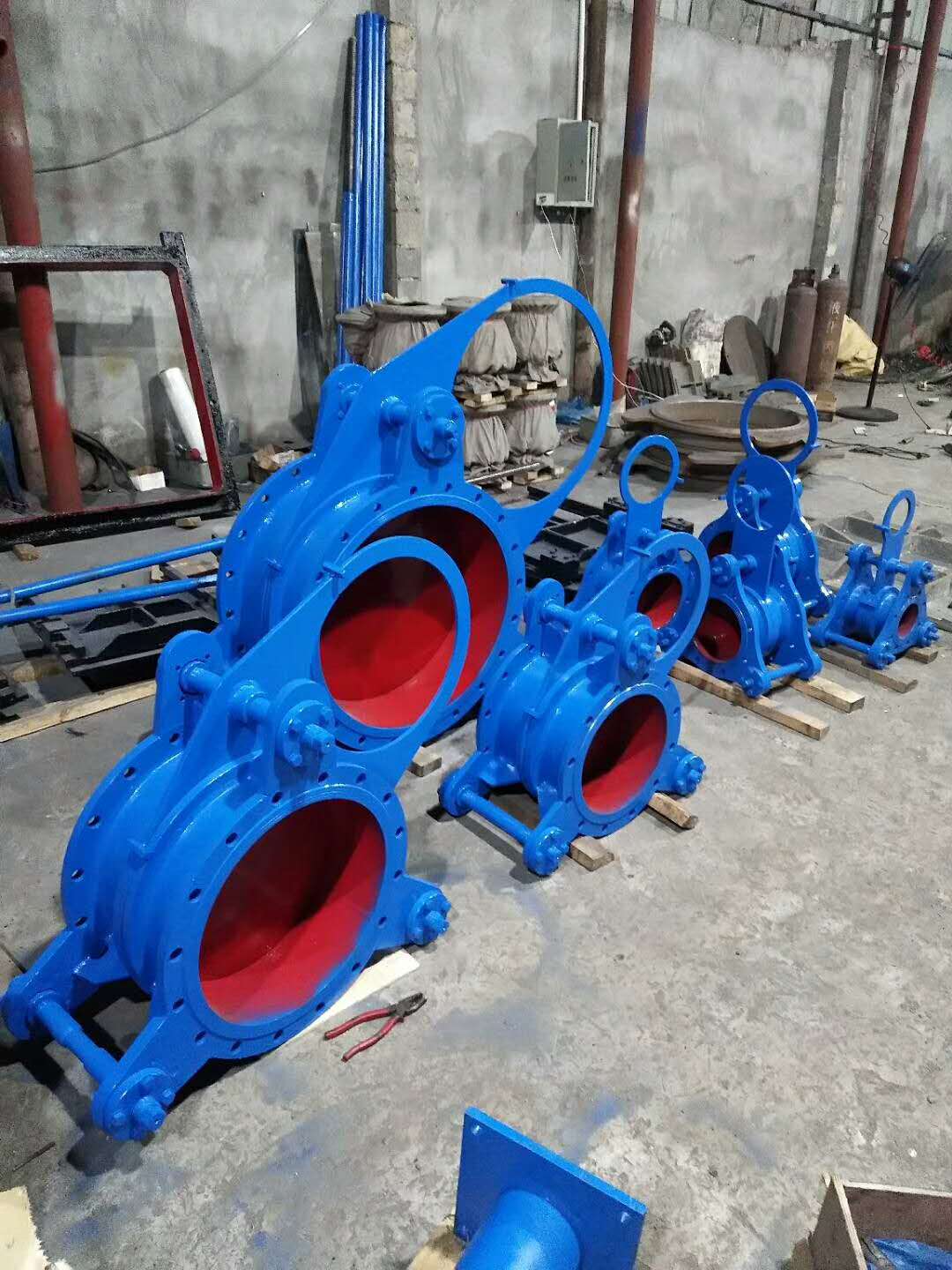 該閥門由左閥體、中閥體、右閥體、扇形盲板、絲桿螺母副、不銹鋼補償器、兩個蝸輪傳動器等零件組成。它是通過三根絲桿連成一體,并由三個閥體分別固定在底座上、構成一個剛性結構體。中閥體與右閥體用不銹鋼膨脹管聯(lián)接,左、中閥體分別用三根兩端帶左右梯形螺紋的絲桿聯(lián)接,將三根絲桿同時做正向(或反向)旋轉,則左中閥體得到壓緊(或分離)。三根絲桿中上面一根絲桿中間裝有盲板,盲板繞該軸心旋轉。下面兩根絲桿在同樣的部位上安裝有盲板的定位塊,盲板旋轉時可防止盲板漂移,避免密封膠圈擦傷。其中一根上裝有蝸輪傳動機構,實現(xiàn)松開夾緊閥體的目的。